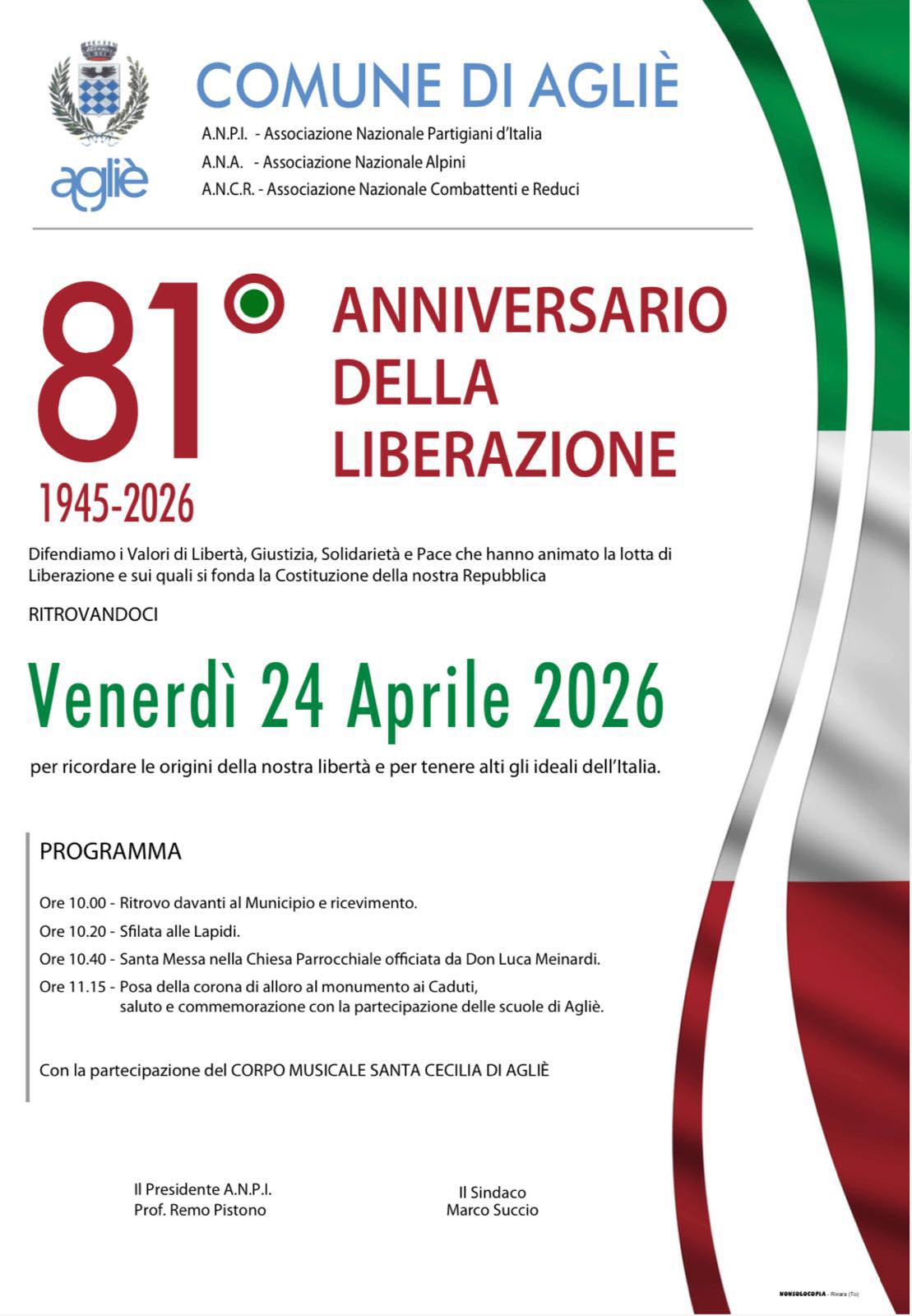 Il Comune di Agliè, in collaborazione con l'A.N.P.I. (Associazione Nazionale Partigiani d'Italia), l'A.N.A. (Associazione Nazionale Alpini) e l'A.N.C.R. (Associazione Nazionale Combattenti e Reduci), organizza l'81° Anniversario della Liberazione. L'evento si propone di difendere i valori di Libertà, Giustizia, Solidarietà e Pace, fondamentali nella lotta di Liberazione e nella Costituzione della Repubblica Italiana.
