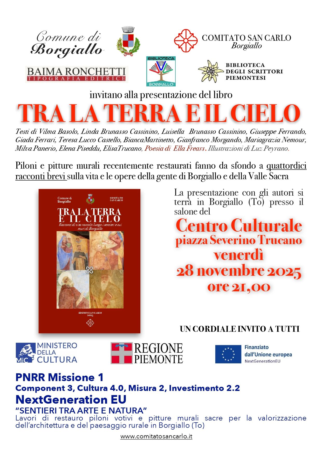 Venerdì 28 novembre alle ore 21 nel salone del Centro culturale di piazza Severino Trucano a Borgiallo, nel cuore della Valle Sacra, si terrà la presentazione del libro: «Tra la terra e il cielo»