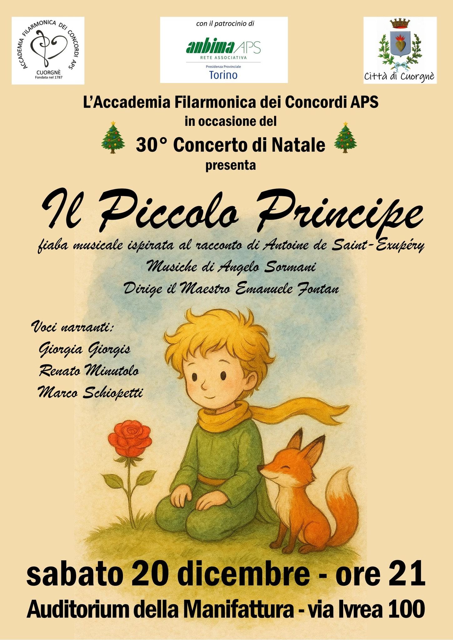 Sabato 20 dicembre presso l'Auditorium dell Manifattura a Cuorgnè l'Accademia Filarmonica dei Concordi, in occasione del 30° Concerto di Natale presenta "Il Piccolo Principe"