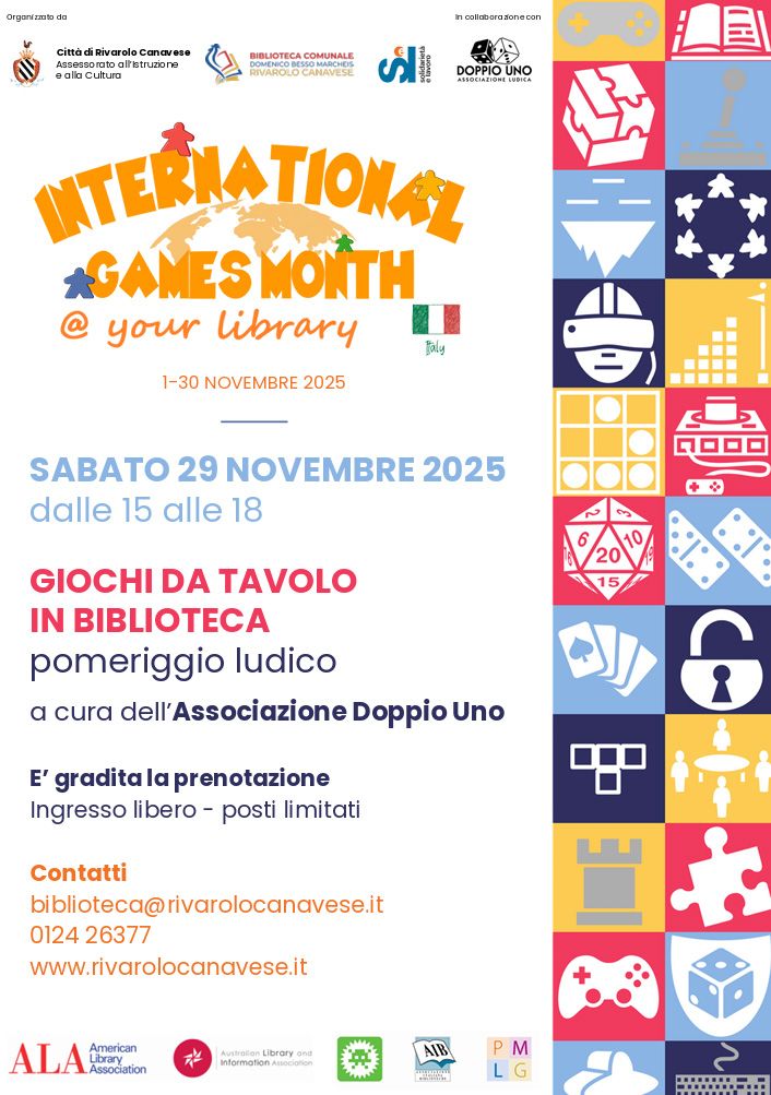 Sabato 29 novembre, dalle 15 alle 18 in occasione dell’International Games Month, l’Associazione Doppio Uno proporrà un pomeriggio ludico in biblioteca