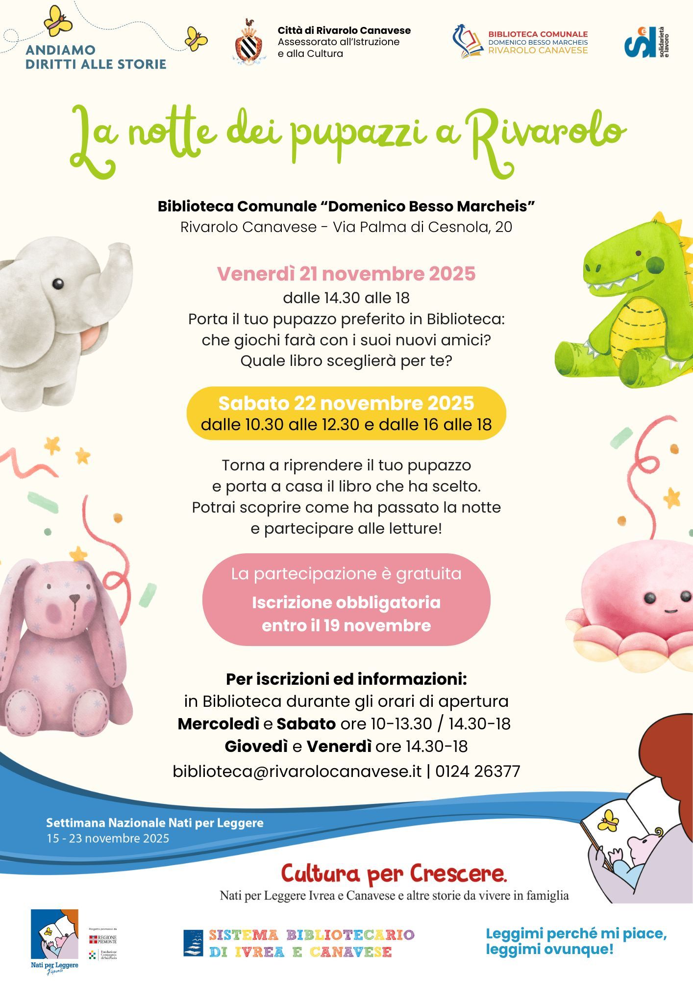 Venerdì 21 novembre, dalle 14.30 alle 18, bambine e bambini (età consigliata da 0 a 6 anni) potranno consegnare il loro pupazzo preferito: trascorrerà la notte esplorando i libri tra gli scaffali