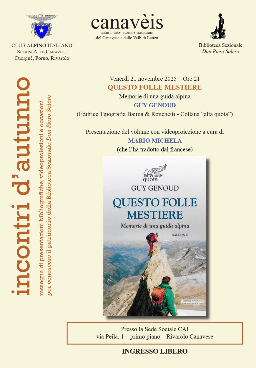 Il libro verrà presentato dal suo traduttore, Mario Michela, venerdì 21 novembre 2025, alle ore 21, presso la sede CAI di Rivarolo Canavese, via Peila, 1 – primo piano
