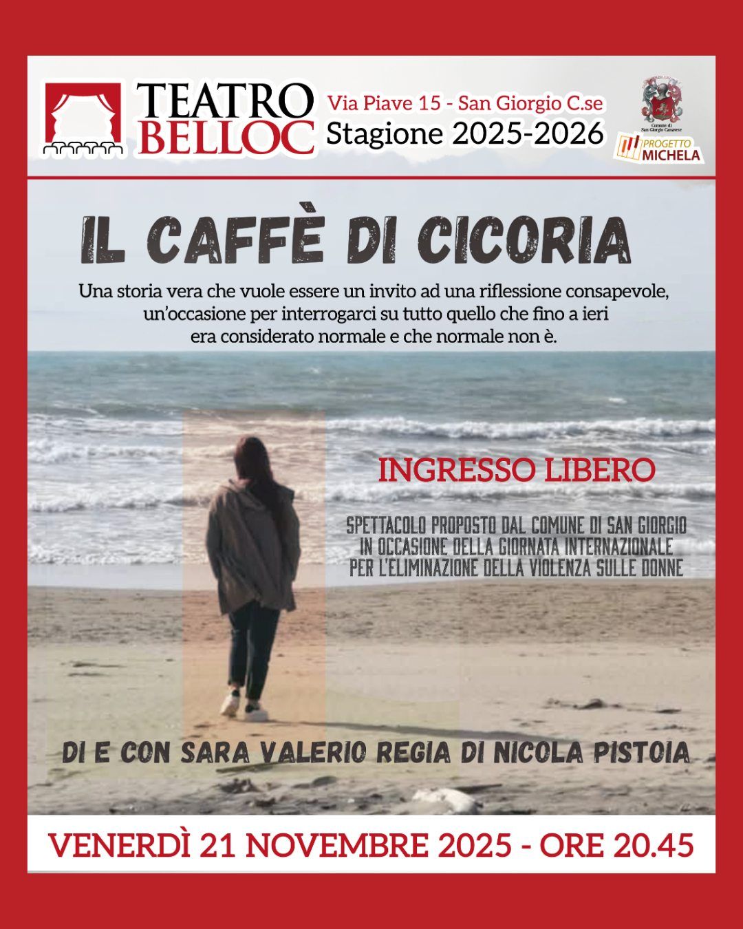 Insieme all'Amministrazione Comunale e la Direzione del Teatro Belloc vi invitiamo venerdì 21 novembre, in teatro per uno spettacolo che arriva dritto all’anima: “Il Caffè di Cicoria”