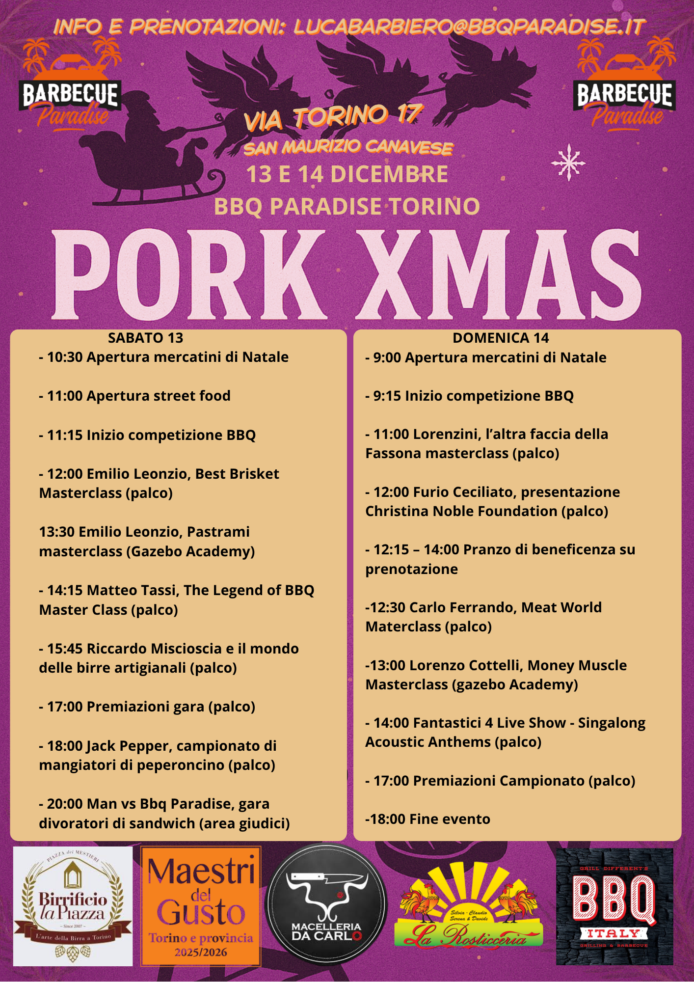 Anche quest'anno il 14 e 15 dicembre è confermata la Pork Xmas, il grande raduno natalizio dei Grillers di tutta Italia che si conferma uno degli eventi più attesi da tutti gli amanti del Barbecue
